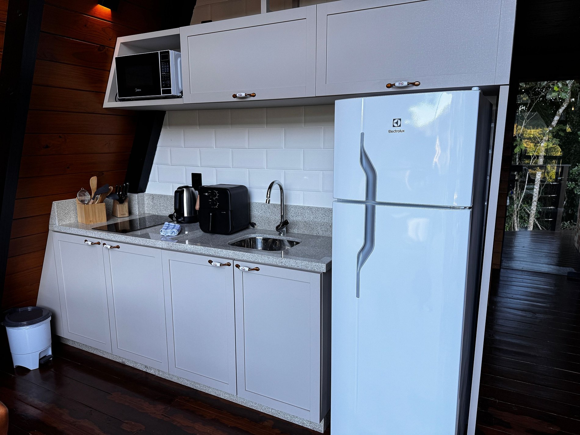 • Cozinha completa: fogão, geladeira com freezer, micro-ondas, liquidificador, air fryer, chaleira elétrica, panelas, taças de vinho, utensílios, louças e talheres para preparo e refeições. Também disponibilizamos açúcar, sal, azeite de oliva, esponja, pano de prato e detergente. Não possui forno.