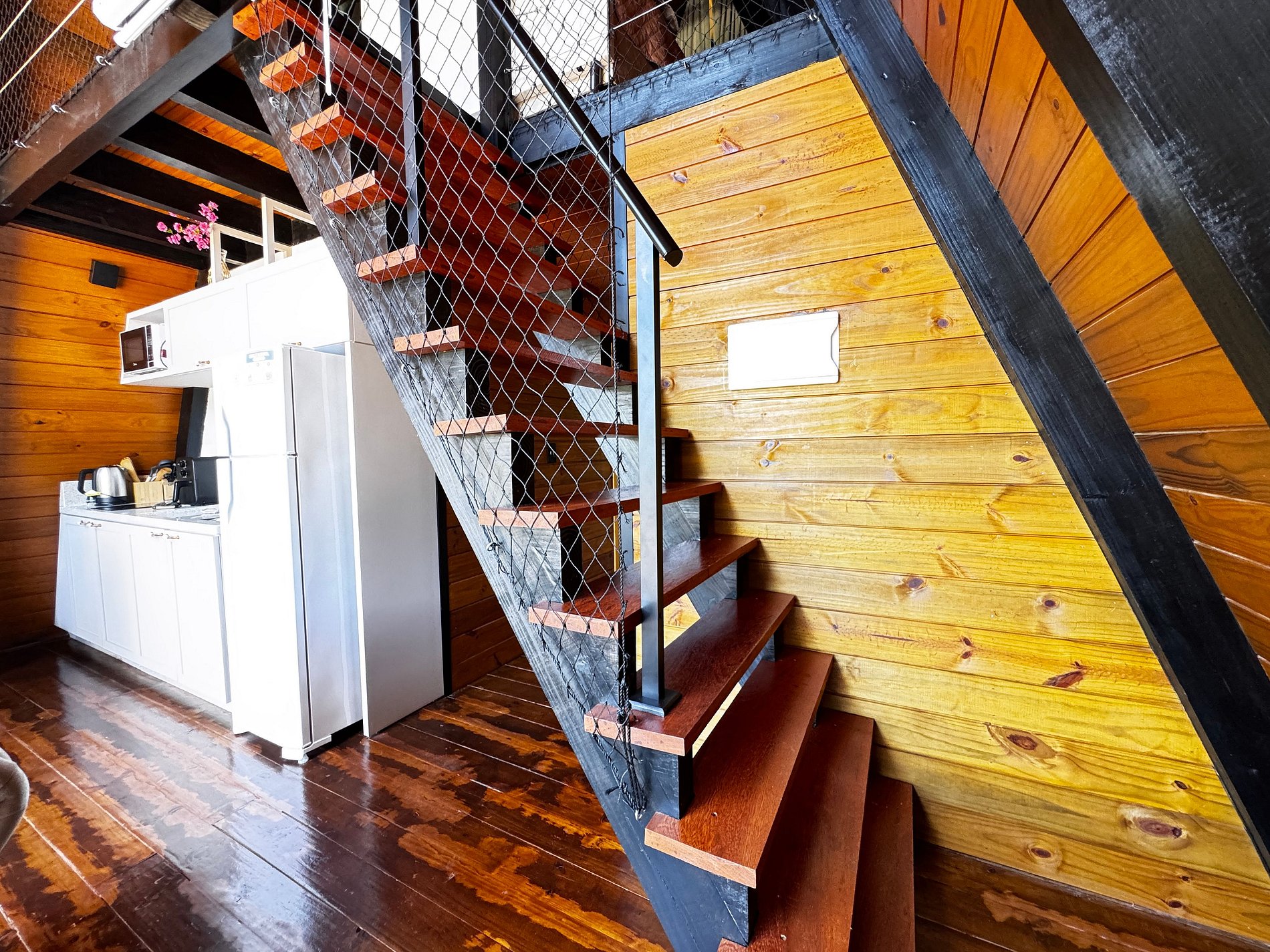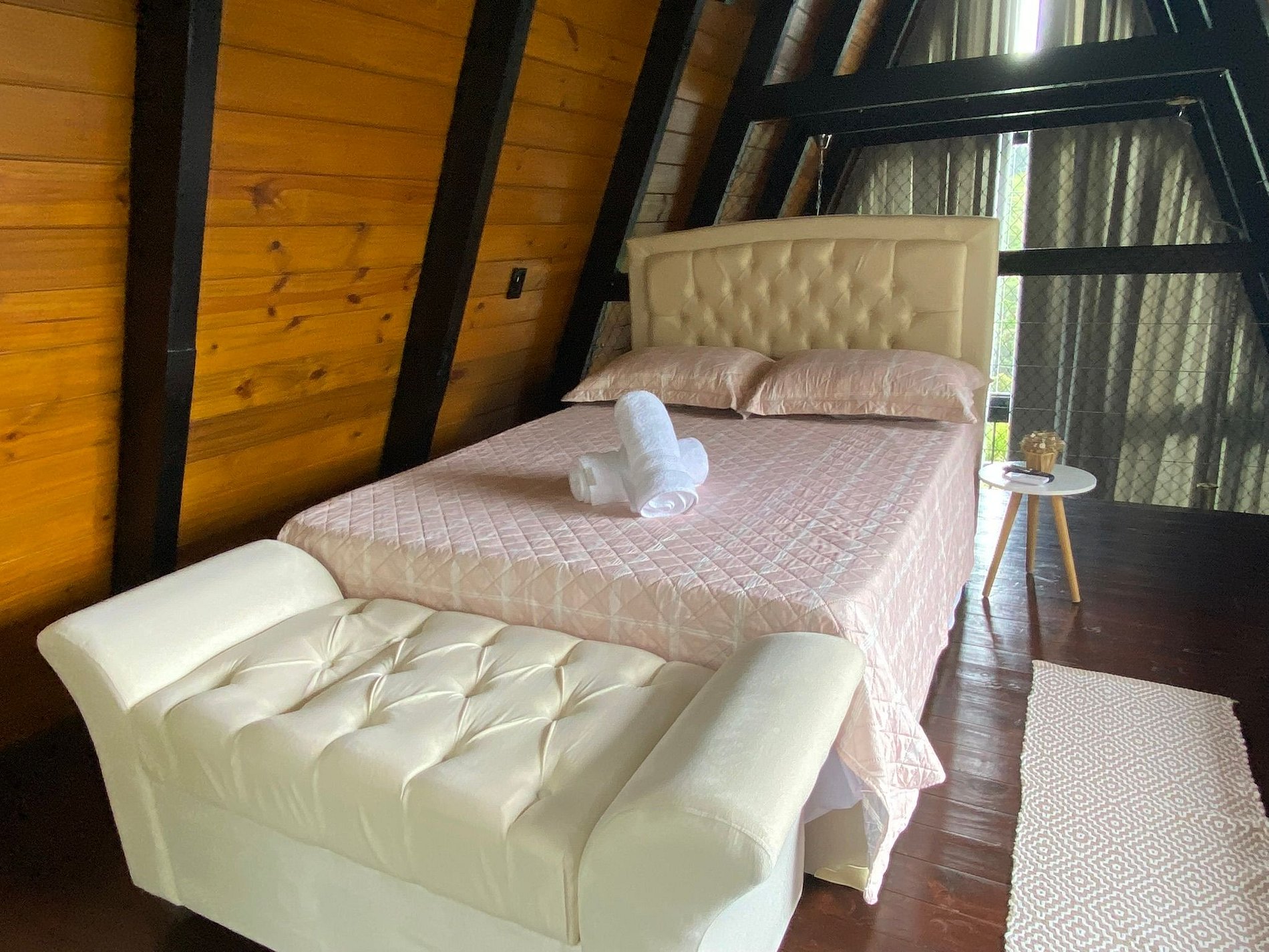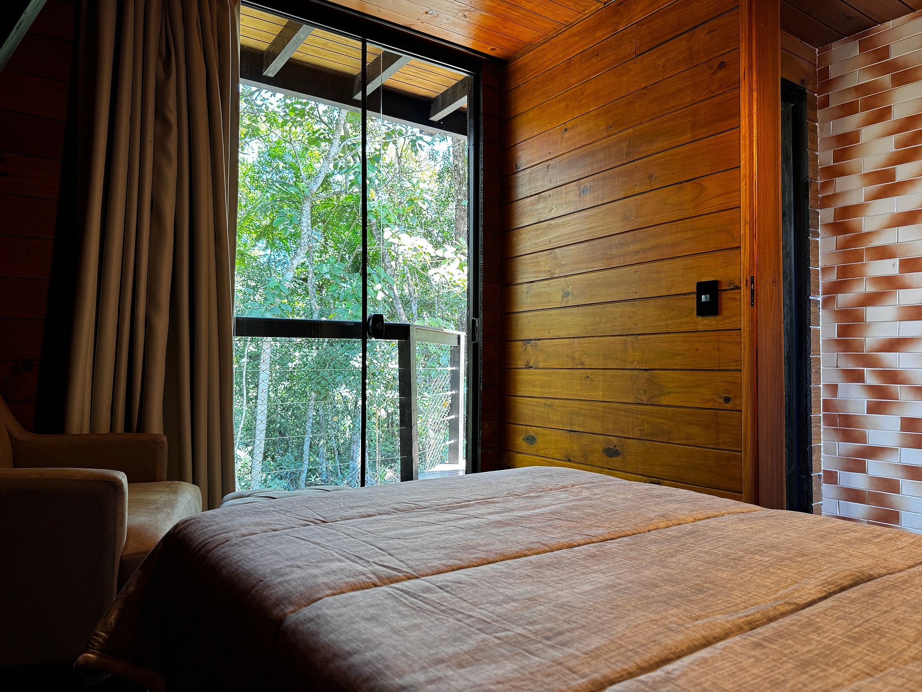 • Mezanino: cama de casal, TV, ar-condicionado quente e frio, além de banheira de hidromassagem com vista para a mata e o vale.